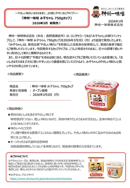 神州一味噌 生味噌『神州一味噌 み子ちゃん 750gカップ』2026年3月 新発売!